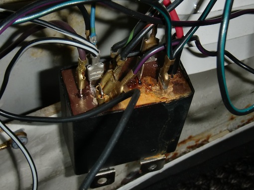 フロントグラスのシールの間から雨水が漏れて、リレーのケース内に溜っていました。